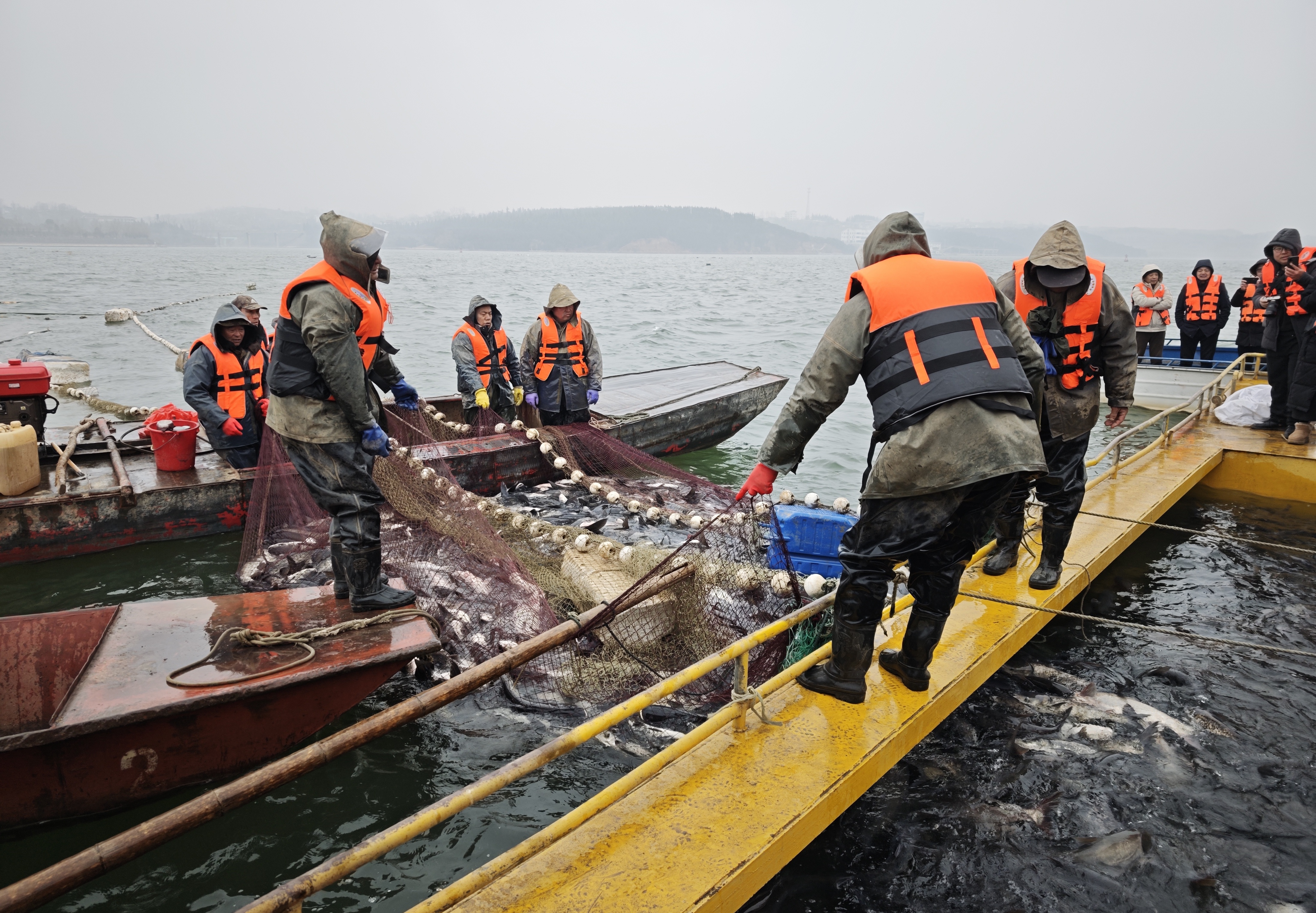 Photo taken on January 29 shows fishermen launching the fishing season at Luhun Lake.