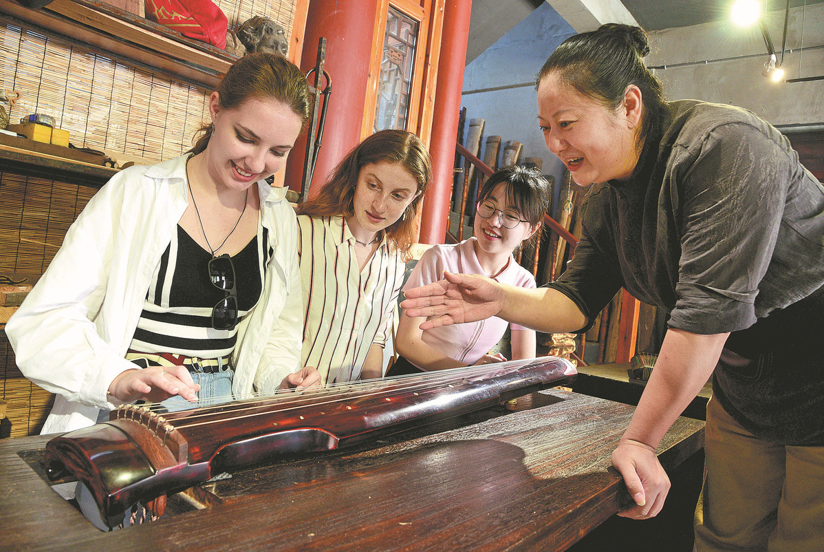 A teacher shows two international students how to play the guqin, a traditional Chinese instrument, in Zhenjiang, East China's Jiangsu province, on June 9. SHI YUCHENG/FOR CHINA DAILY