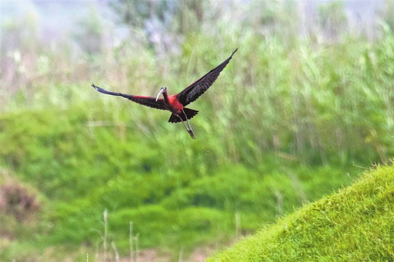"If lucky, we might see glossy ibis again! I've shot it here for several times over the past few days!" Bird enthusiast Yue Hengwere excitedly talking with his companions on May 13 in the Danjiang Wetland National Nature Reserve in Dashiqiao town, Xichuan county, Nanyang city, Central China's Henan province.