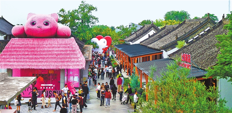 Photo taken on October 7 shows crowds of tourists spending their holiday in Weipo village of Chaoyang town, Mengjin district, Luoyang city, Central China's Henan province. As a traditional Chinese village and a provincial-level historical and cultural village, Weipo has revitalized its rural resources by integrating Ming and Qing Dynasty architecture with modern industries and cultural elements. (Text: Henan Daily Photo: Huang Zhengwei)