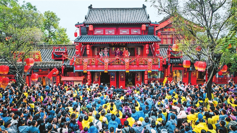 Photo taken on October 1 shows tourists enjoying the Qingming Riverside Landscape Garden or the Millennium City Park in Kaifeng city of Central China's Henan province in light autumn rain during the National Day and Mid-Autumn Festival holiday. (Text: Henan Daily Photo: Wang Zheng, Xing Xiaoyue)