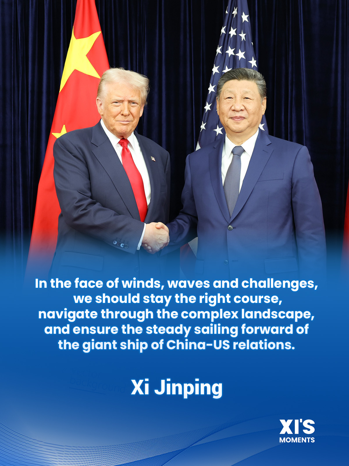 President Xi Jinping met with US President Donald Trump in Busan on Thursday, conveying his readiness to continue working with President Trump to build a solid foundation for China-US relations and create a sound atmosphere for the development of both countries.