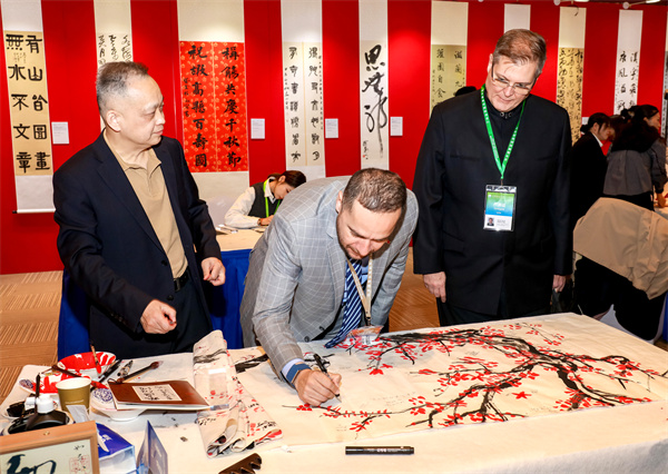 A guest signs a traditional Chinese ink painting during the event. [Photo provided to China Daily]