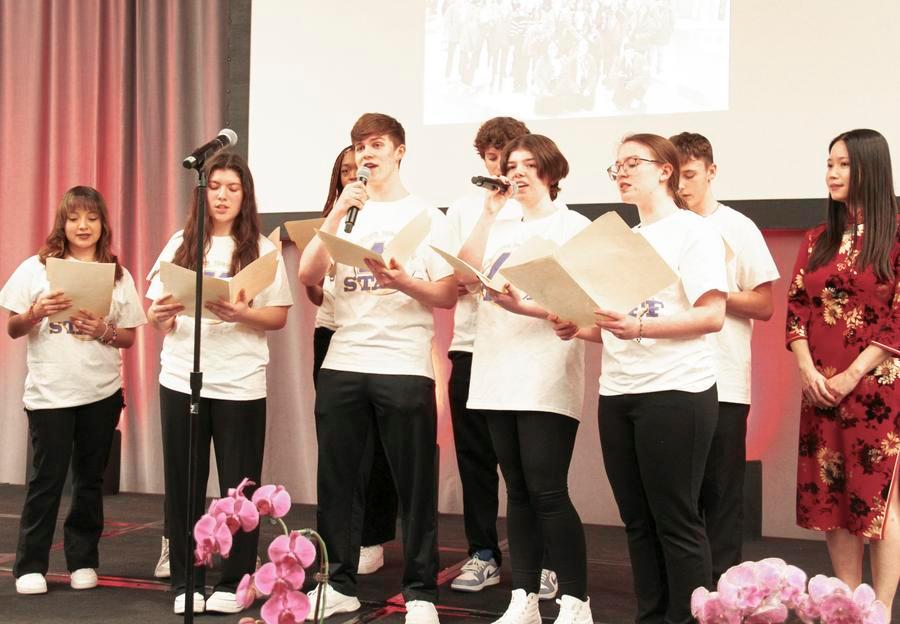Students from Muscatine High School sing a song in Chinese at a reception marking the 45th anniversary of the establishment of China-US diplomatic relations in Chicago, the United States, Feb 27, 2024. [Photo/Xinhua]