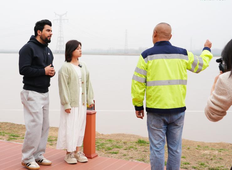 Ali and a reporter listen to the history of the three bridges over the Yellow River, as explained by a bridge staff member, along the riverbanks in Zhengzhou, Henan province, on March 23, 2026. [Photo/chinadaily.com.cn]