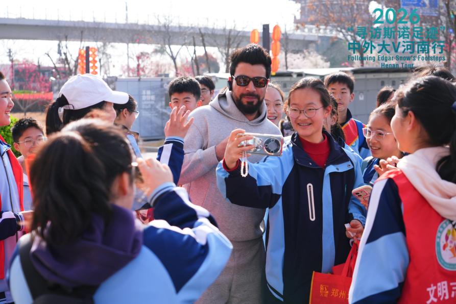 Ali takes a selfie with a group of students from Chanhe Experimental School in front oftheSui-Tang Dynasties Grand Canal Museum in Luoyang, Henan province, on March 25, 2026. [Photo/chinadaily.com.cn]